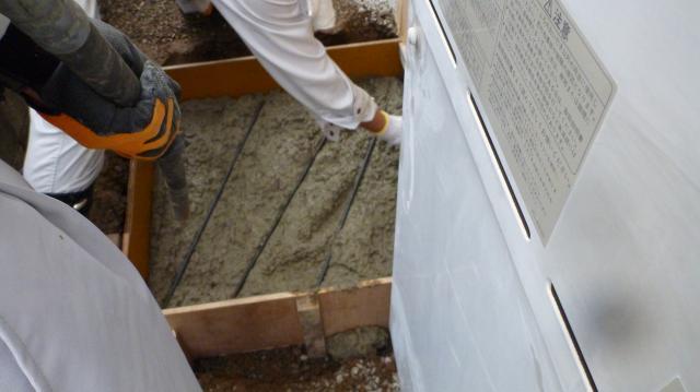鉄筋を加えてから、バイブレーターで中の空気を抜きます。そのことでより強度が増し、仕上がりの際の見栄えも綺麗になります。