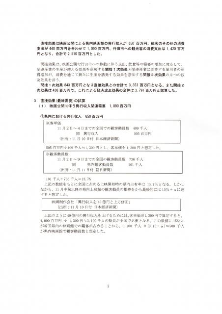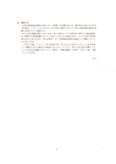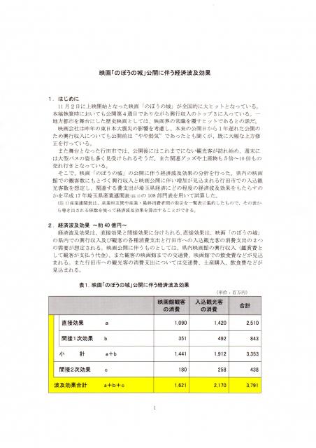 話は変わりますが、映画「のぼうの城」で埼玉の経済効果38億円との試算を武蔵野銀行関連のシンクタンク「ぶぎん地域経済研究所」が発表しました。