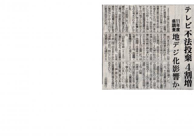 2011年度に市町村が回収した廃家電4品目(家電リサイクル法の対象)の不法投棄台数が前年度より30.4%増えたことが、県のまとめで分かったそうです。