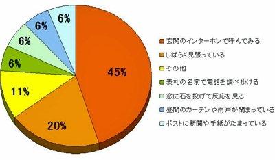 (財)都市防犯研究センターの調査によると、多くの空き巣は入る前に下見を行い留守を事前に確認、その確認方法として約45%がインターホンで呼んでいるそうです