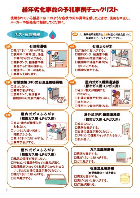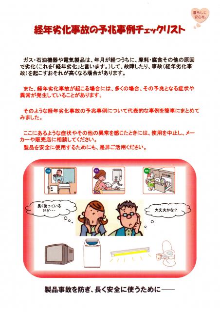 以下の経済産業省が作成・公表している「経年劣化事故の予兆事例チェックリスト」をご参考にしてください。