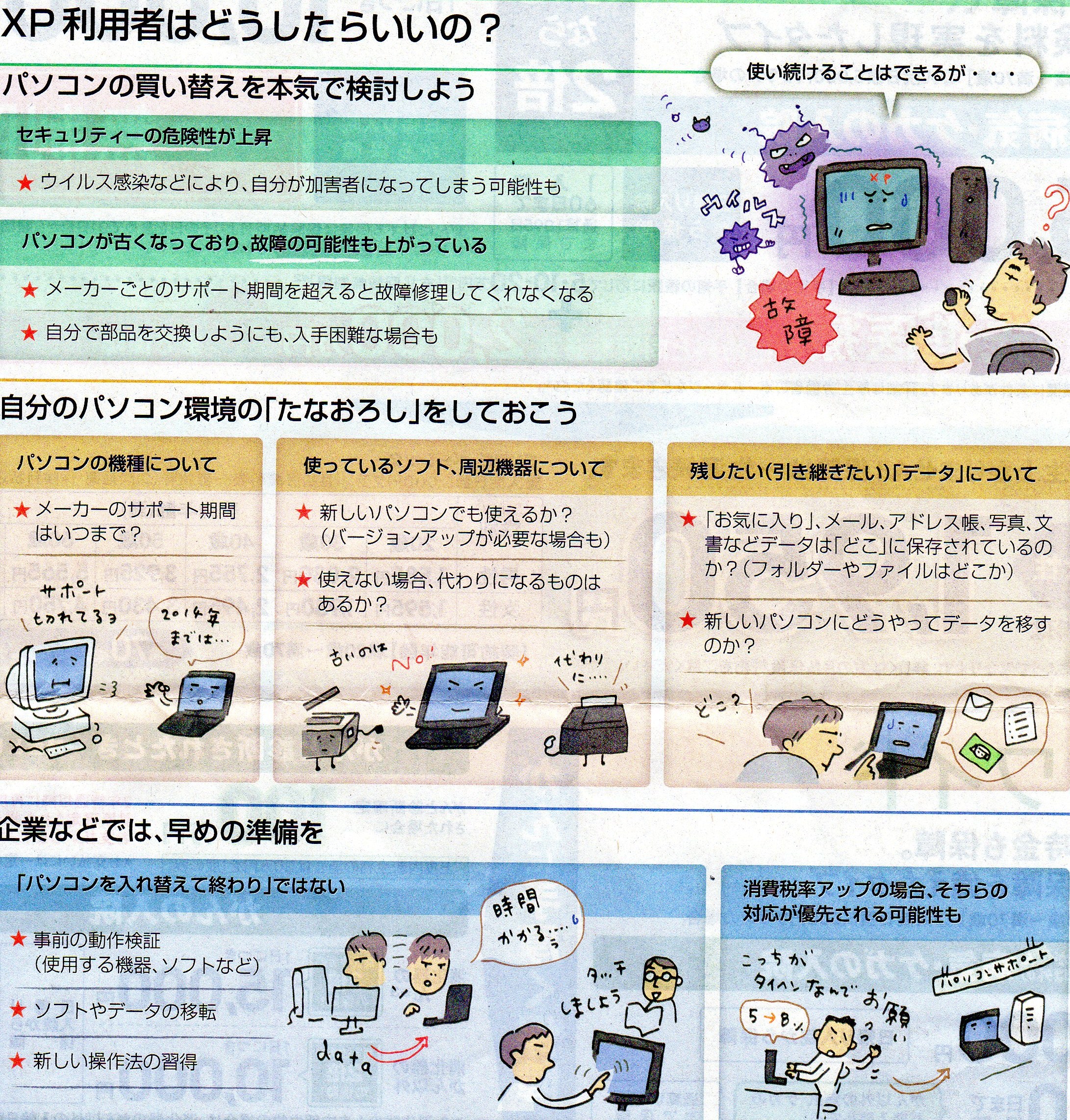 いまはまだ大丈夫だとしても、サポート期間が終わってもXPを使い続けるというのは家で例えると穴の開いた家を補修せずに住み続けるようなもの。XP自体が耐震構造のないビルのようなものです。