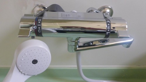 サーモスタット付きでお湯の温度調整ができる節水型シャワーに交換しました。