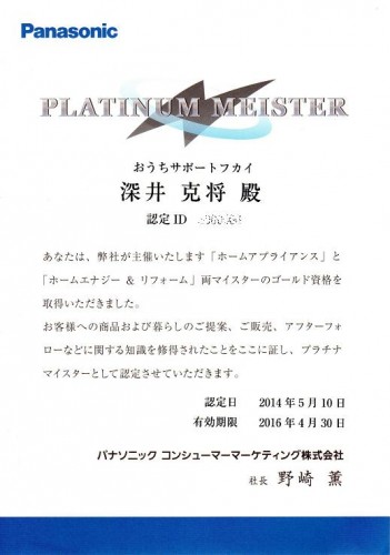 Panasonicブランド商品の提案、販売、アフターサービスなどに関する総合的な知識を習得したとして、プラチナマイスターとして認定いただきました!