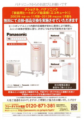 今朝のテレビや新聞等の報道で既にお耳にされていることと思いますが、ナショナル・パナソニック「家庭用ヒートポンプ給湯機(エコキュート)」にコンプレッサーの破損の恐れがあるとリコールが発表されました。