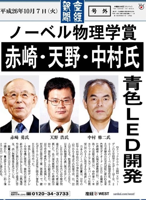 なんと3人の受賞者のうちの一人、赤崎勇氏はパナソニック(旧松下電器)出身の研究者だったそうです。