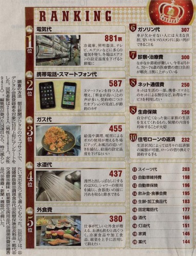 家計のどこにメスを入れるかが大きな差になると思いますが、ランキングをみると1位から4位までが家庭の光熱水費と現代人には手放せないスマホ代となっております。