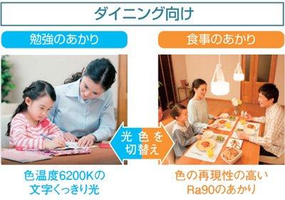 ダイニングは食事をする場所だけでなく、子供がいるご家庭では勉強スペースとしても使われがち。電球が2色に切り替えられれば1つのスペースで用途が広がります。ワンルームマンションでも2部屋分のあかりが演出可能になります。