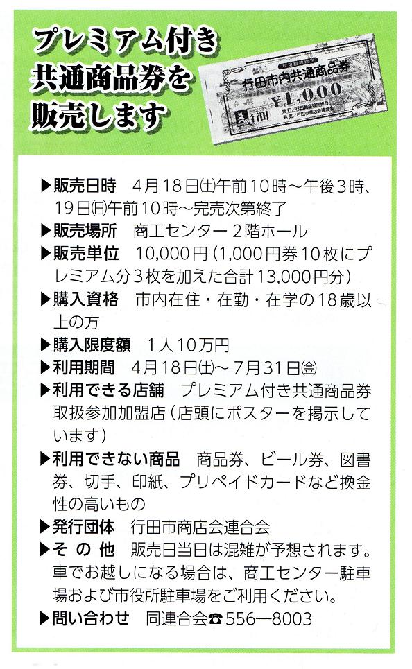 市報ぎょうだ4月号をご覧になられて既にご存知な方もいらっしゃるかと思いますが、行田市商店会連合会では、消費喚起・生活支援のためにプレミアム付き商品券を発行することになりました。