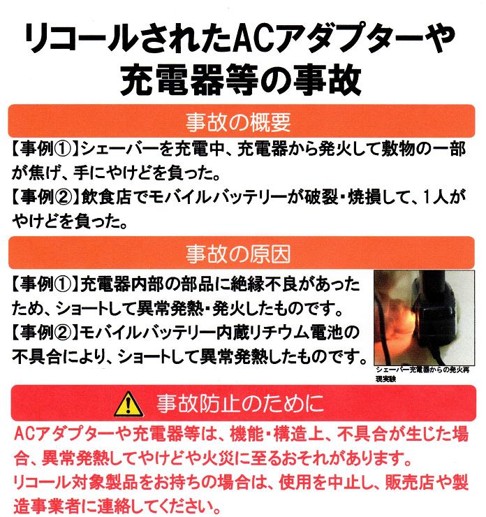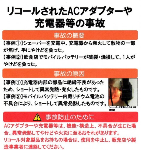 事故の内容は、電気カミソリの充電器が発火して手にやけどをしたとか、コードレス電話機の充電中にACアダプターが発熱して変形したなどというものでした。