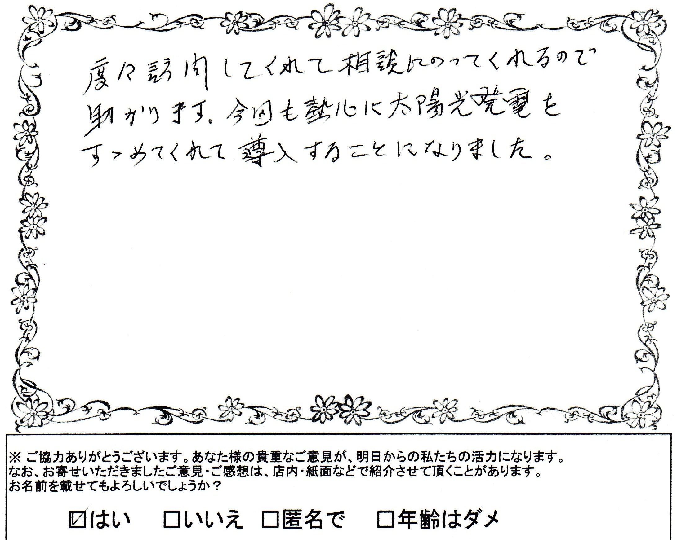 この度は太陽光発電システムの導入ありがとうございます。