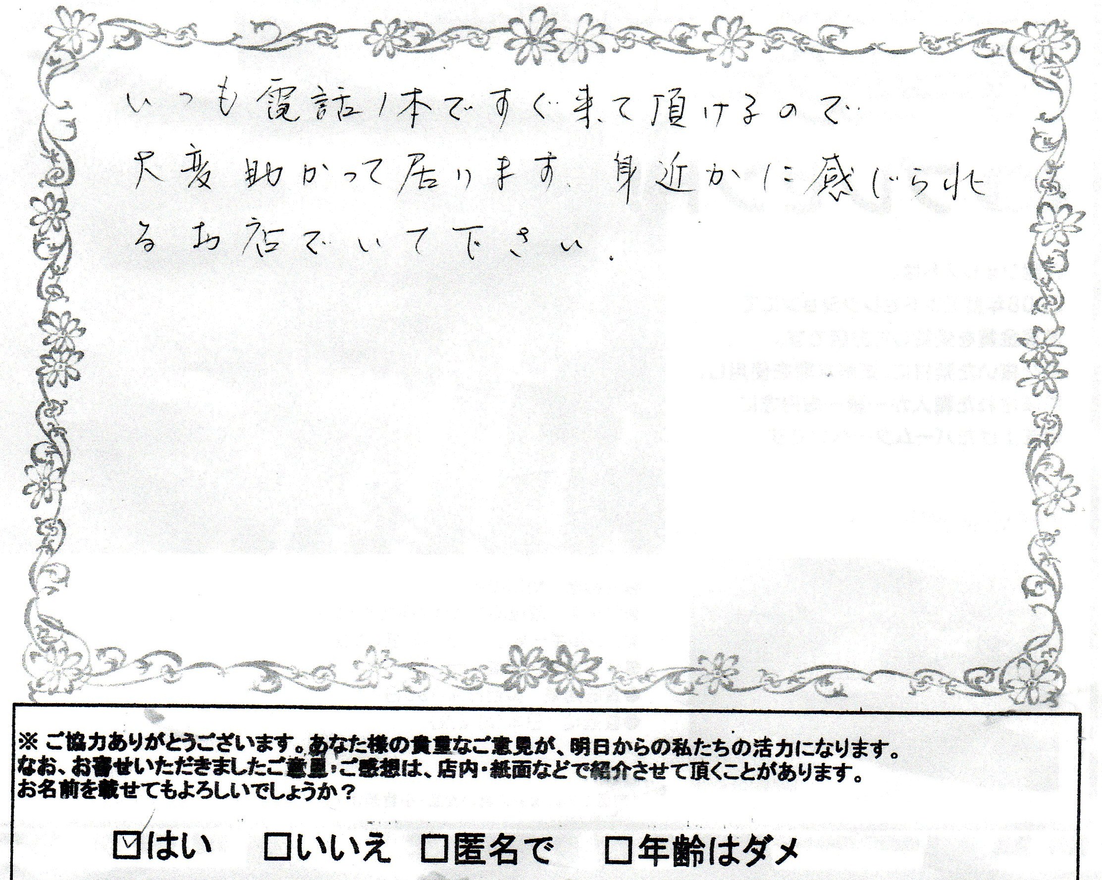 行田市城西O様より大変嬉しいお言葉を戴きました!