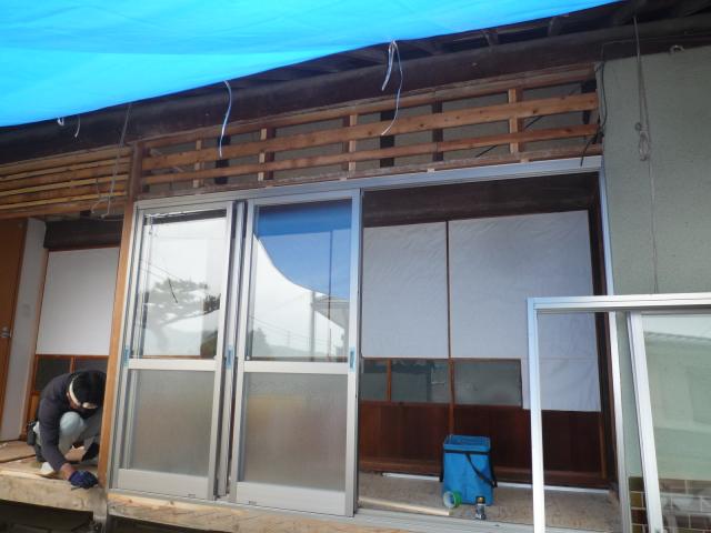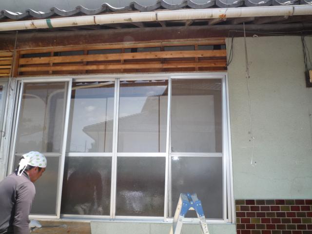 7.水平垂直、収まりなどを調整しながら新しいアルミサッシを取り付けます。