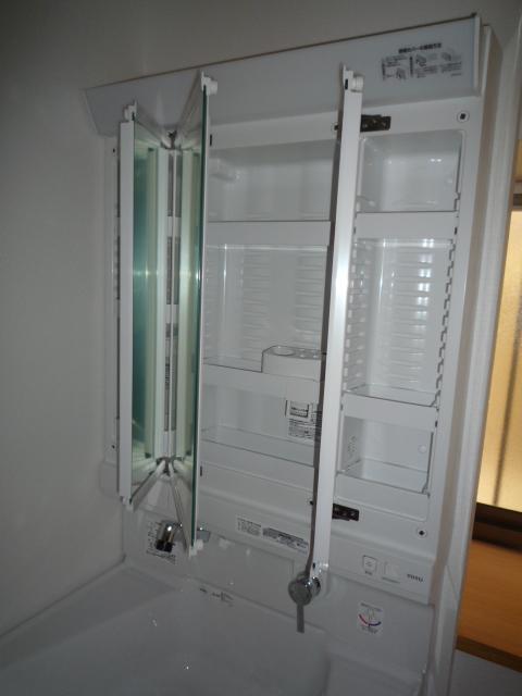 2.化粧台の化粧鏡は3面鏡のタイプです。鏡の裏は3か所とも収納ができます。鏡は、くもり止めコートが施してありますので電気を使わなくてもくもり止めができます。
