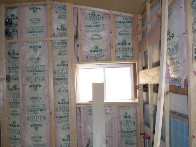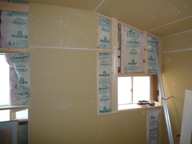 11.グラスウールを敷き詰め終わったら石膏ボードで壁面をつくります。