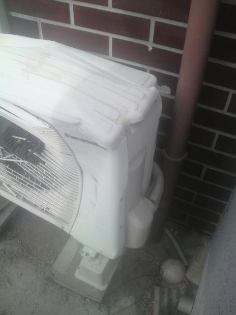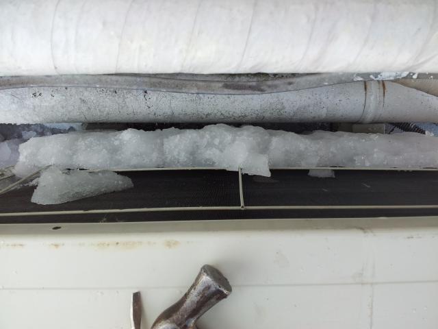 見事に氷が張っています。『エアコンが暖まらへんねん、見に来て』
