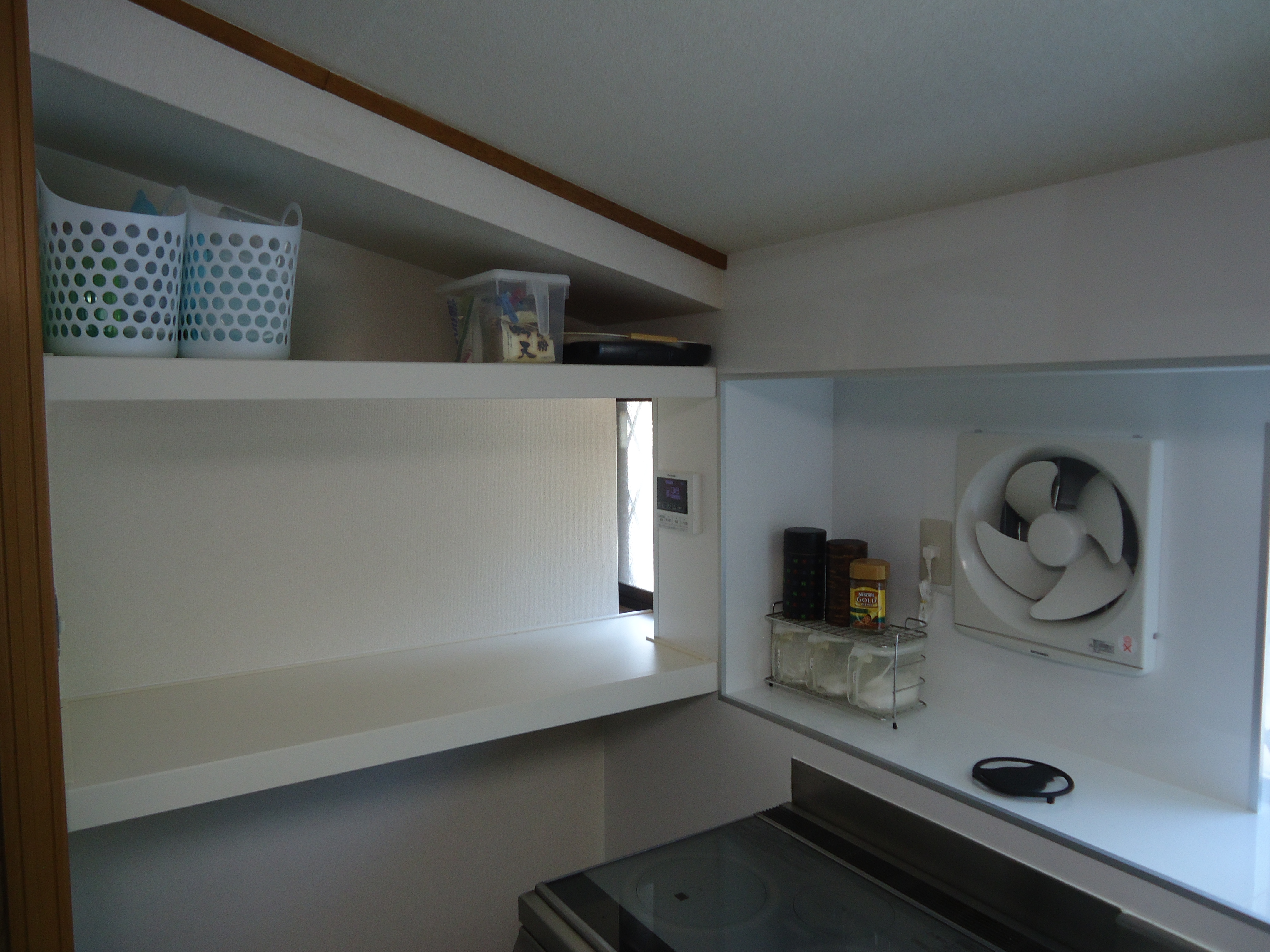 そして、O様のキッチンスペースは実質4畳半、今度は、カップボード・冷蔵庫上のウオールユニット、そして、キッチン上の吊戸と箱がかなり増えます。