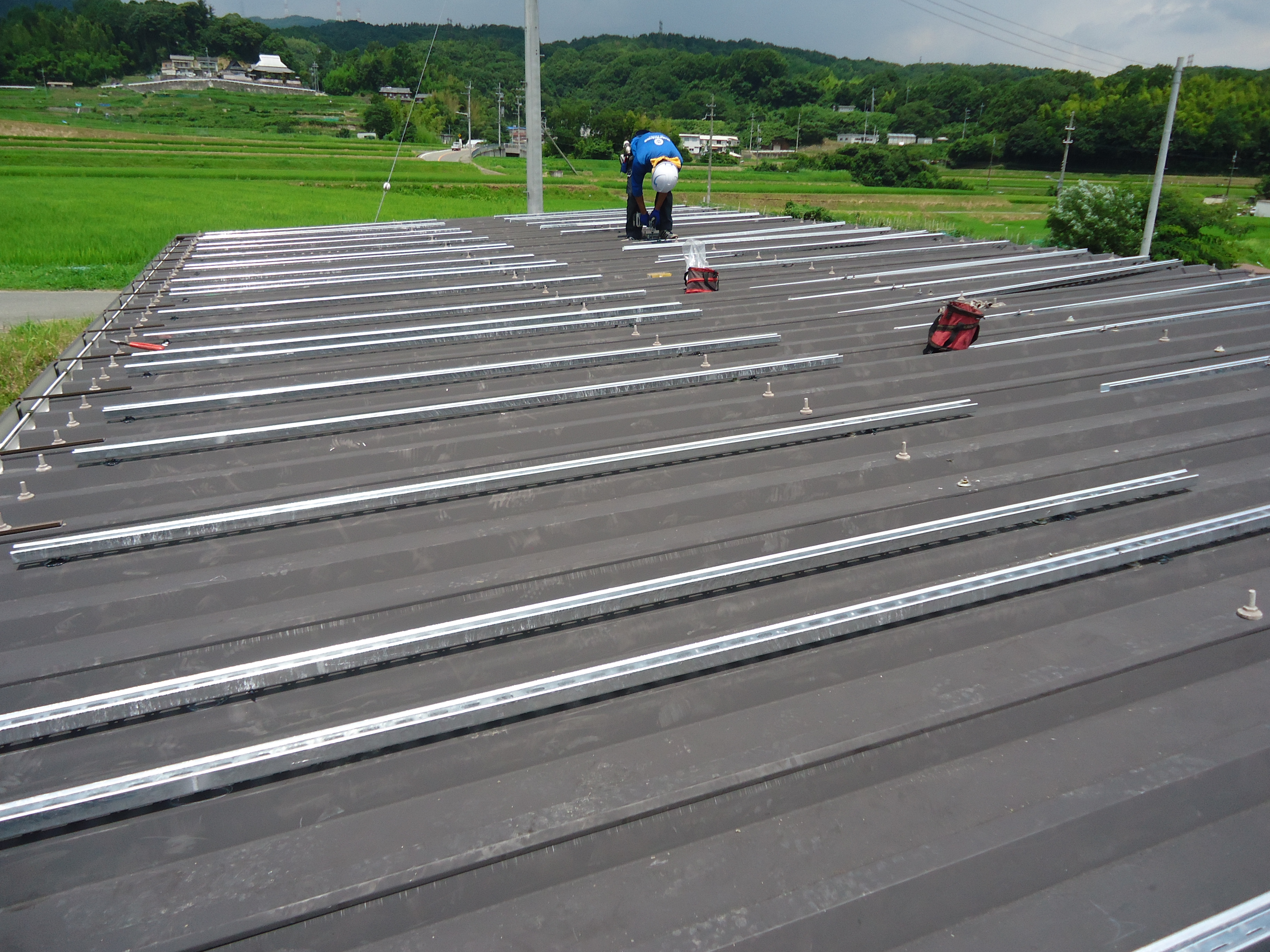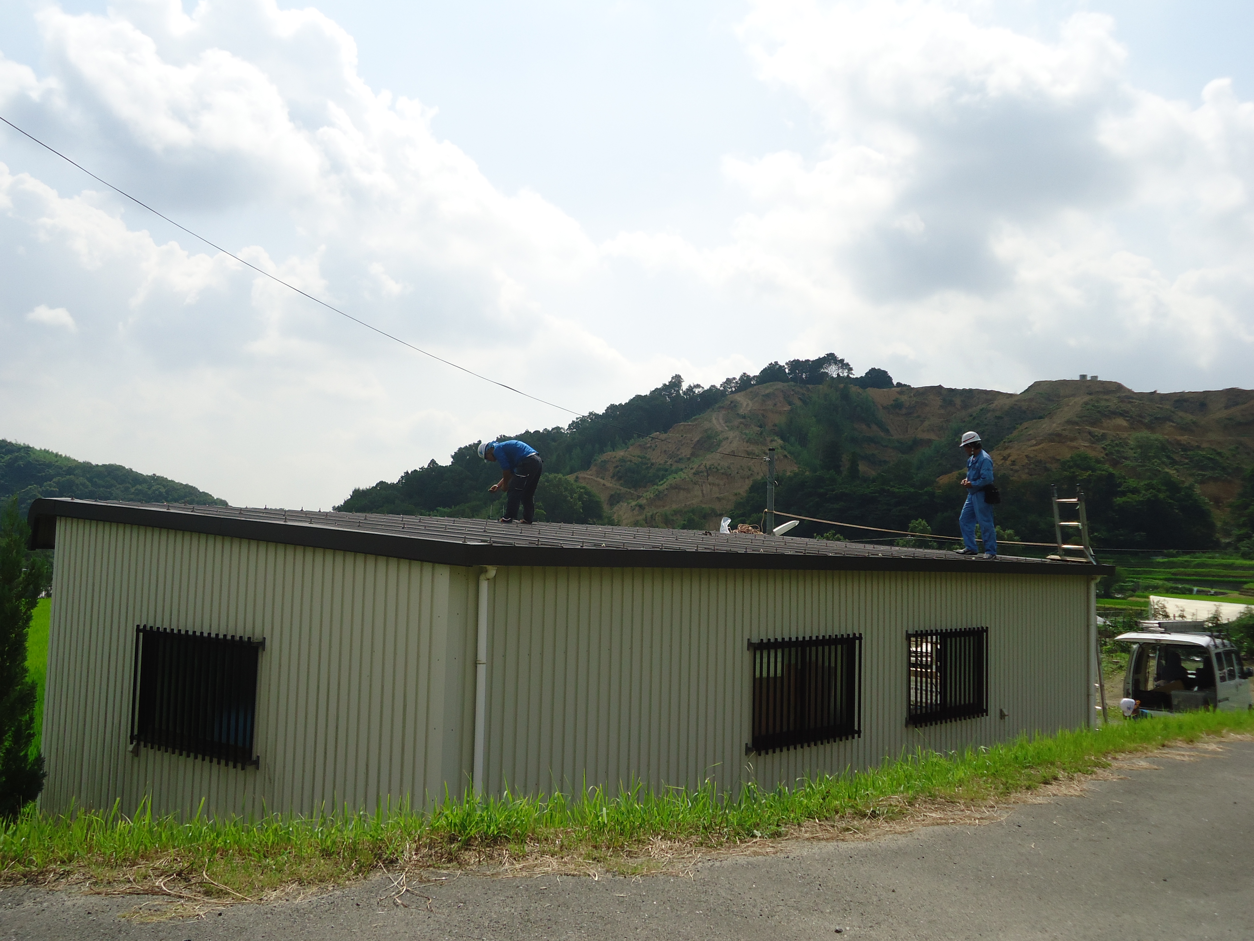 農業倉庫の折半屋根の上は厳しい暑さです。熱中症予防のため水分補給しながら進めたいと思います。