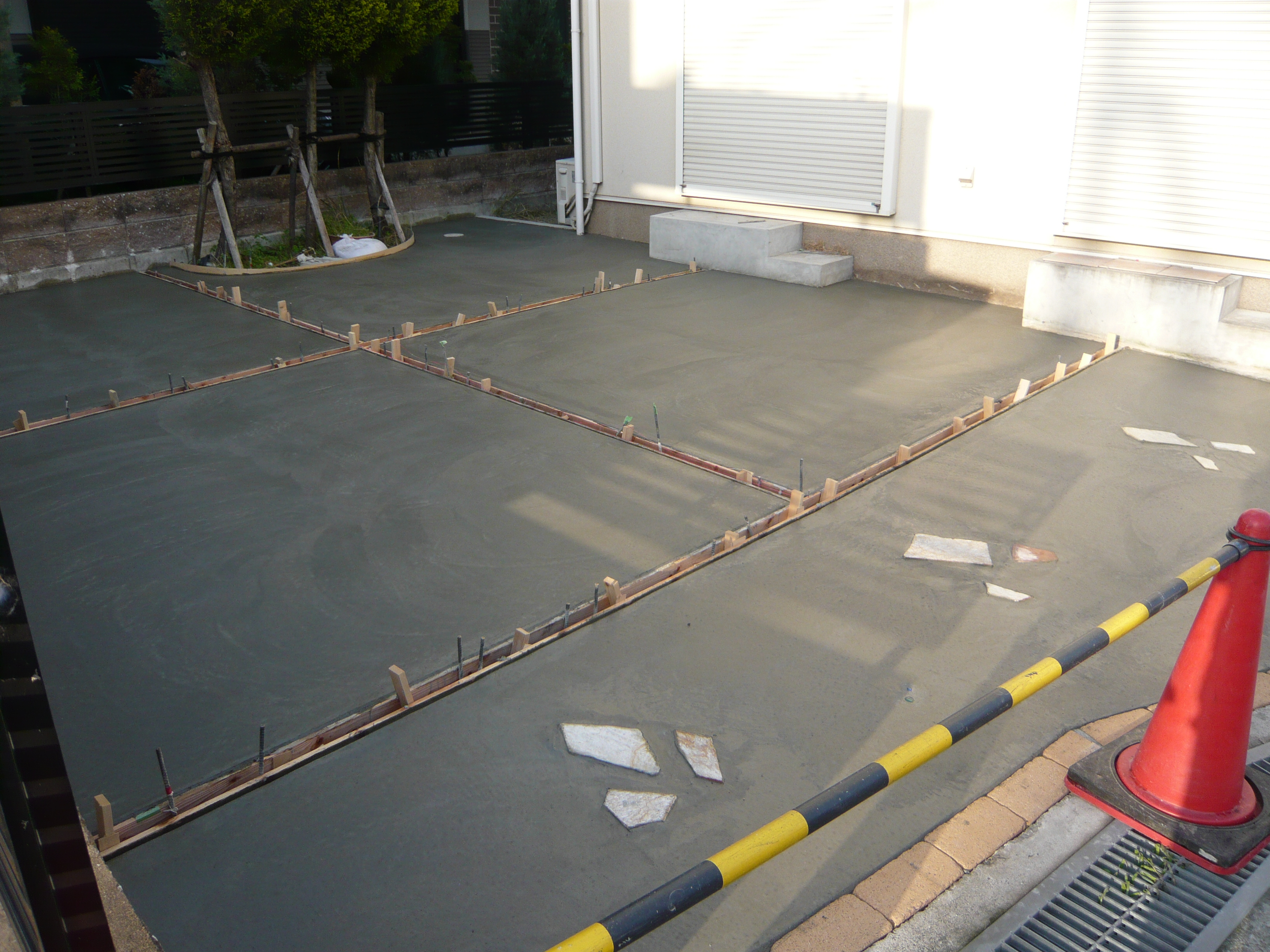大阪府茨木市南春日丘のI様邸は、枕木を置いた土の状態だった駐車場を、コンクリートで土間打ちし、完成後、リビング掃きだし窓からバリアフリーで外に出る為のウッドデッキ迄のリフォームを御計画されています。