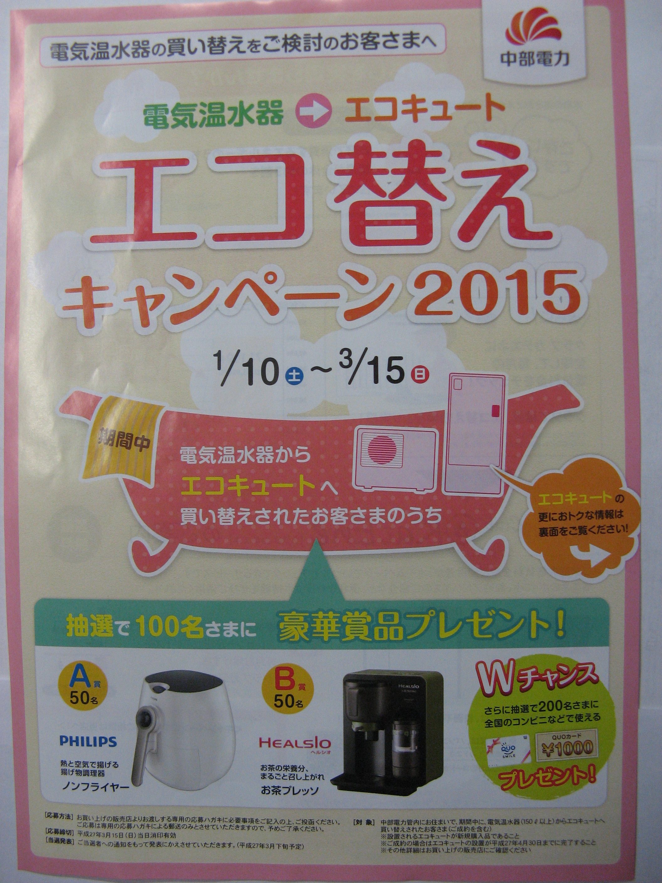 2015年2月14日電気温水器 から エコキュート へ 買い替えされたお客様のうち 抽選で 100名様 に 豪華商品プレゼント です。 キャンペーン期間は、平成27年1月10日 より 3月15日 までです。
