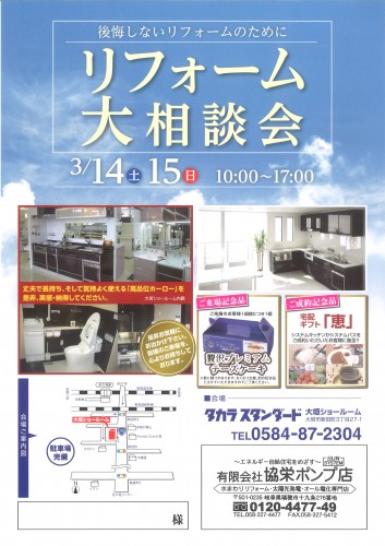 スタッフブログ 2015年3月10日皆様、お世話になります。 来る 3月14日 土曜日と、 15日 日曜日 に タカラショールーム (大垣展示場) でリフォーム相談会 を開催します。
