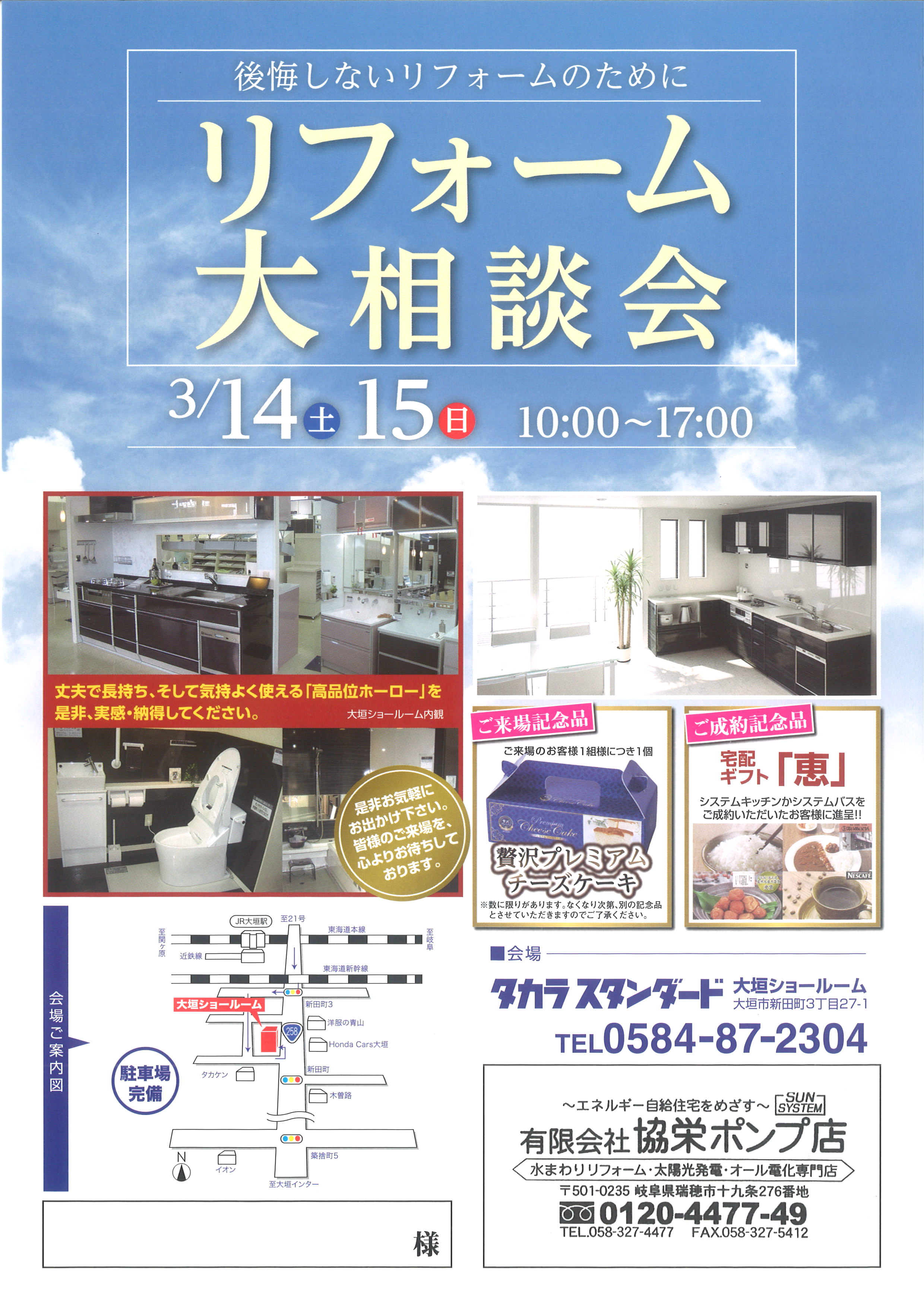 皆様、お世話になります。 来る 3月14日 土曜日と、 15日 日曜日 に タカラショールーム (大垣展示場) でリフォーム相談会 を開催します。