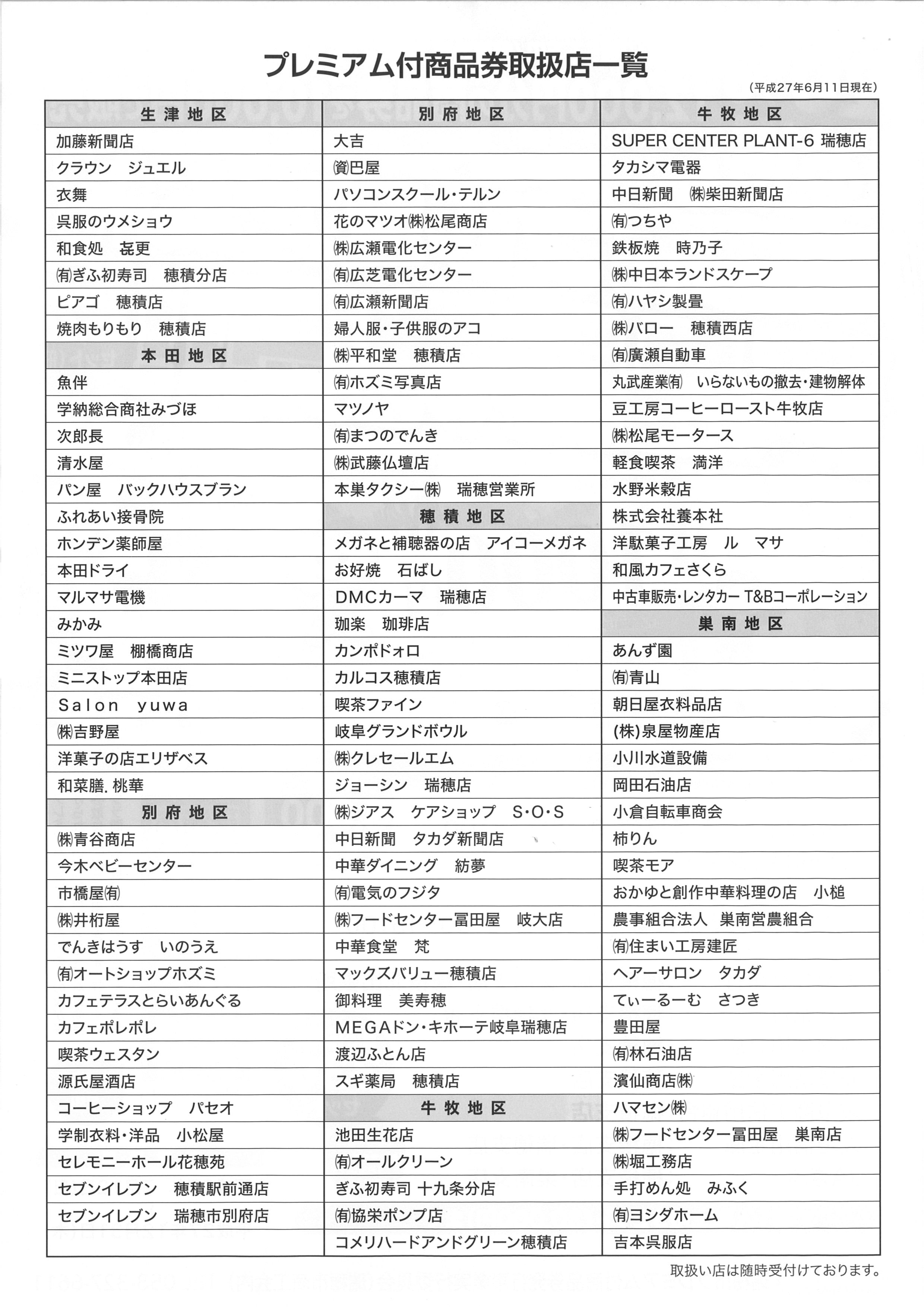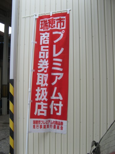 この商品券が使用できるお店は、一覧表にも記載してありますが、 下記 「のぼり : 瑞穂市プレミアム付商品券取扱店」 のあるお店で使用できます。