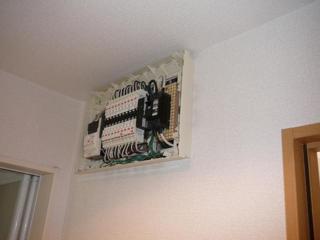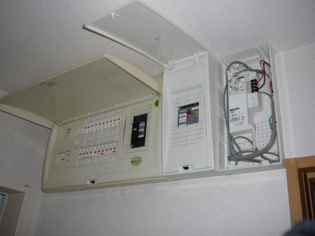 同じ洗面所に配電盤がありますので、太陽光用のブレーカーとモニターユニットを付けます。