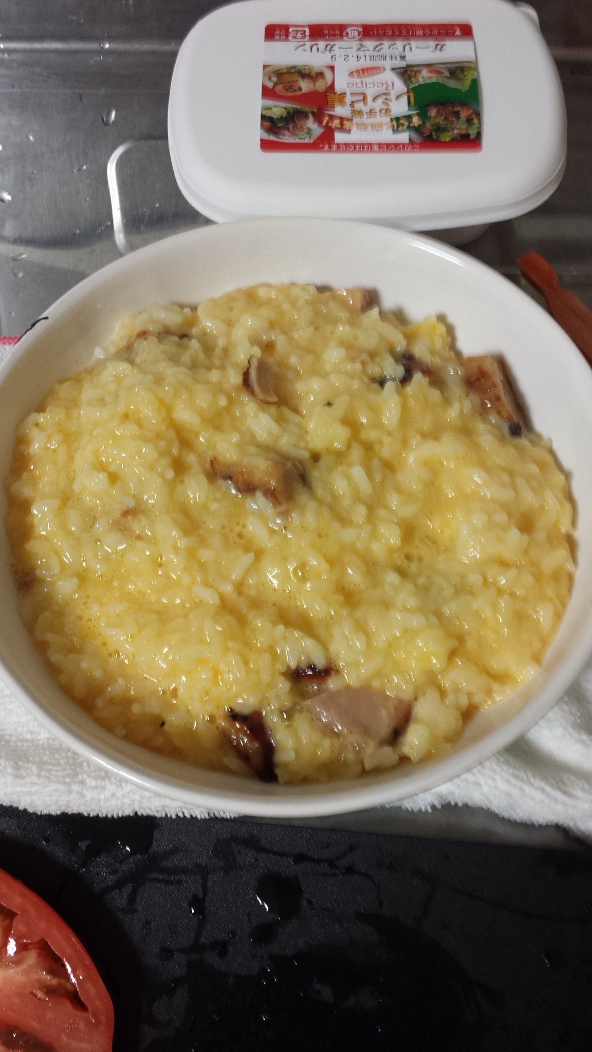 卵かけご飯にスモークチキンを混ぜます