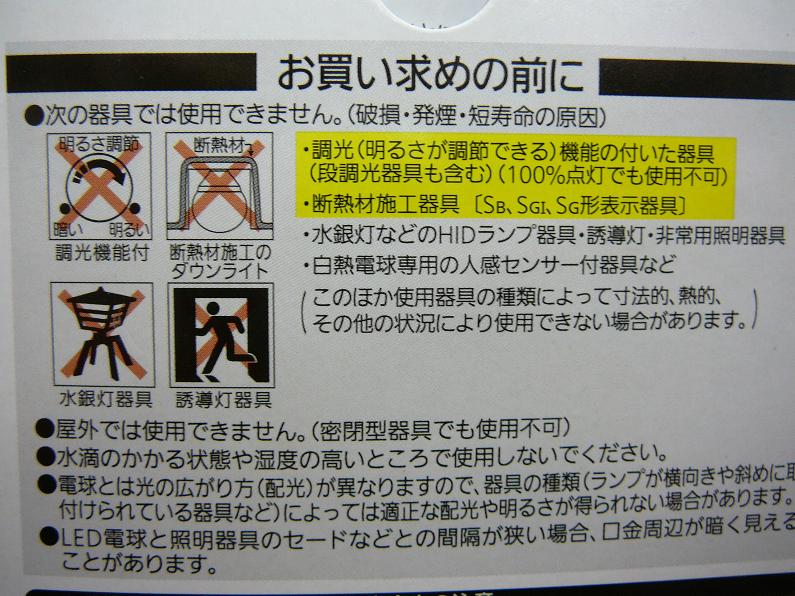ついた器具、断熱材施工のダウンライト、白熱電球専用の人感センサー付きの器具などには
