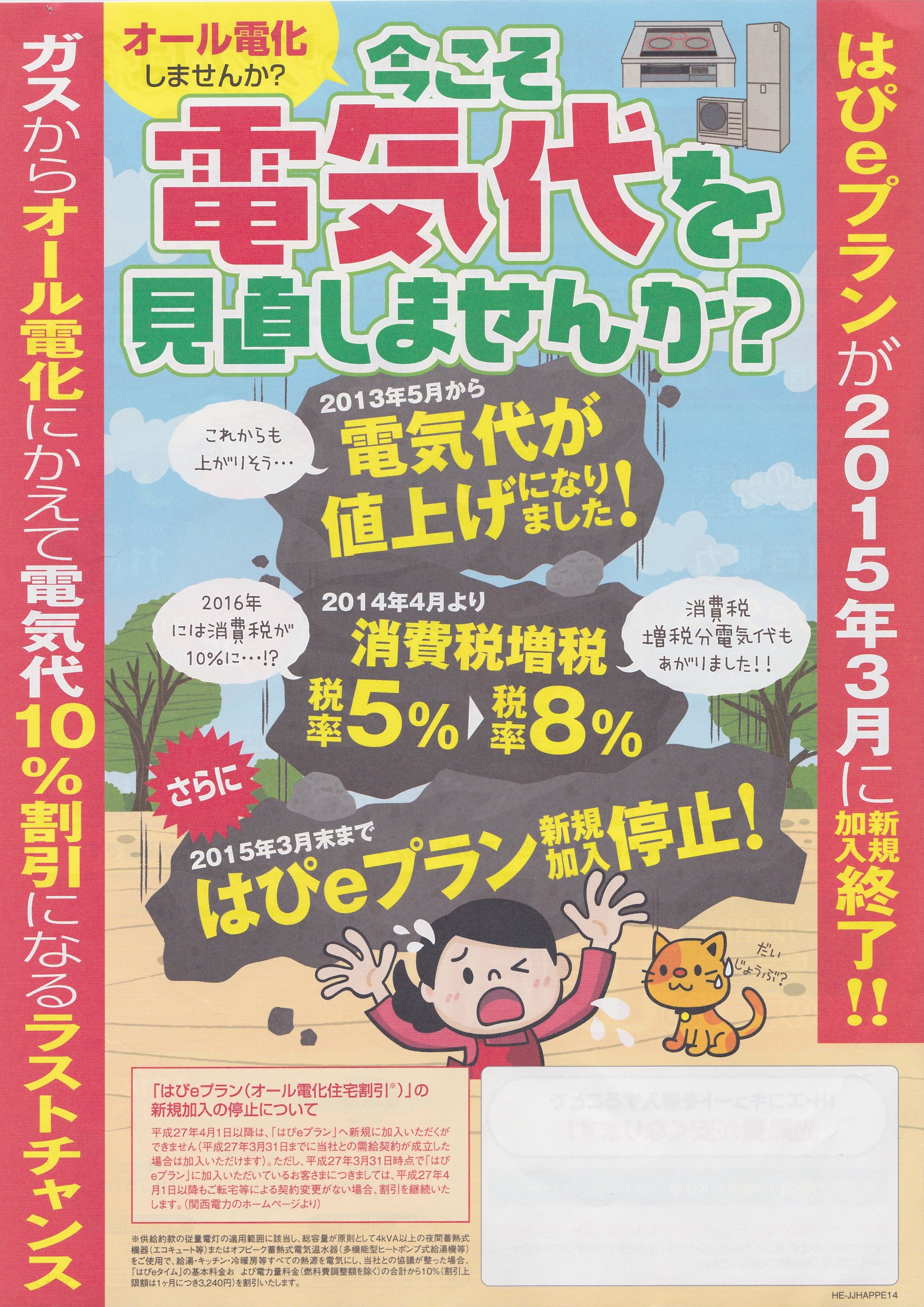 そのようななか、関西電力管内では『はぴeプラン』の名で浸透している、ガスからオール電化にかえての割引プランが、来年3月で新規加入終了します。