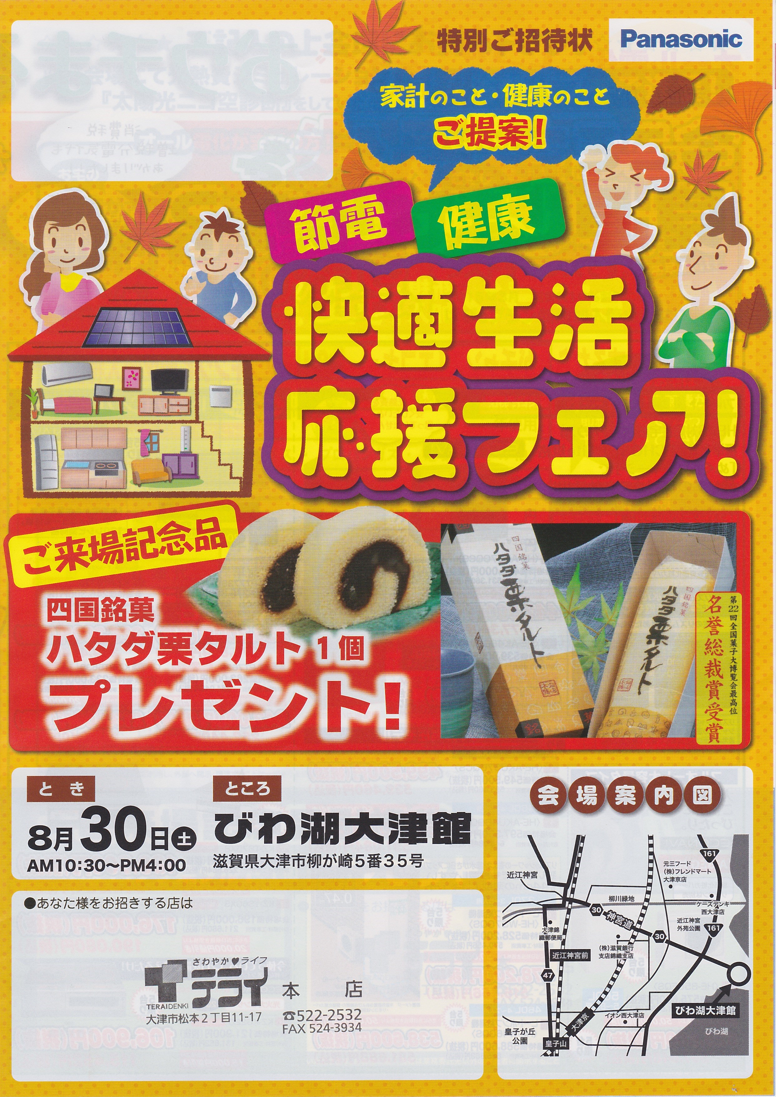 追伸;オール電化、太陽光、風呂・キッチン・トイレなどのご提案、 「パナソニック快適生活応援フェア」 8/30(土)10:30~16:00 於;びわこ大津館で開催。