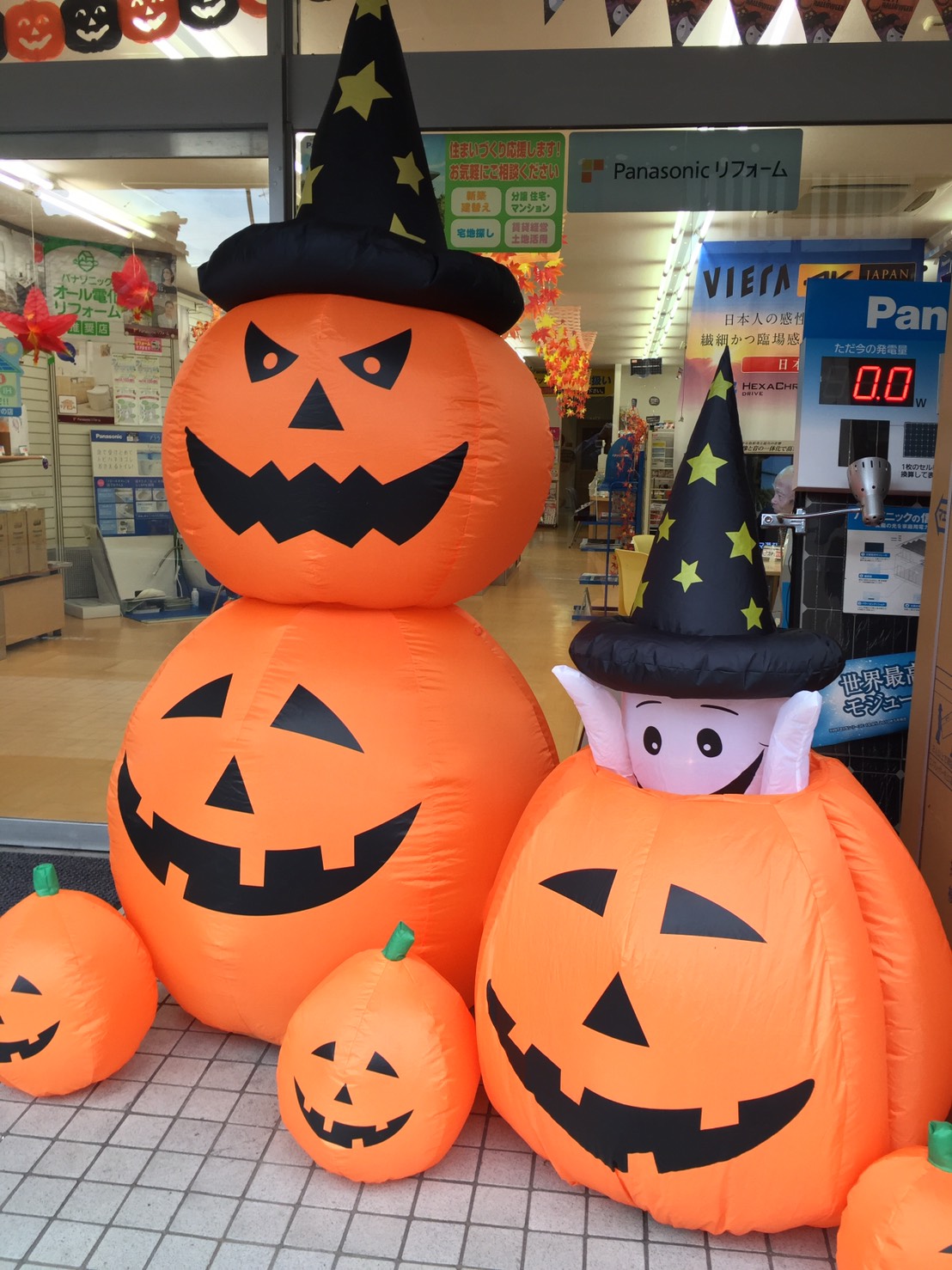 という事で、去年から空気で膨らむ大きなパンプキン(エアブロードールというそうです)を店頭に置いてみました。
