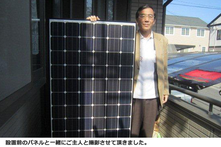 以前、太陽光発電導入をご検討されたという市川様、その時は結局断念されたようですが、今回念願の三菱システムを設置されました。弊社の施工実績を信頼いただき、営業のプランニングにもご満足いただき、スムーズにご契約頂けました。この度は当店にご用命いただきましてありがとうございました。今後も精一杯お客様の太陽光発電生活をフォローして参ります、末永いお付き合い、よろしくお願いいたします。