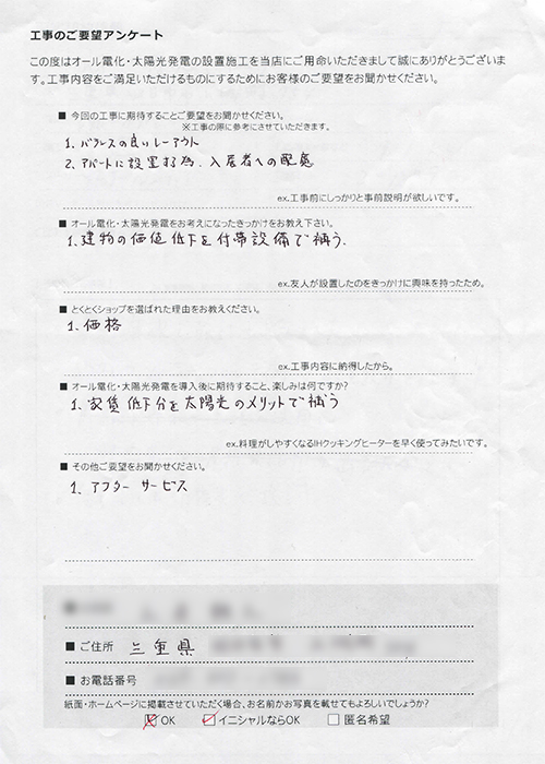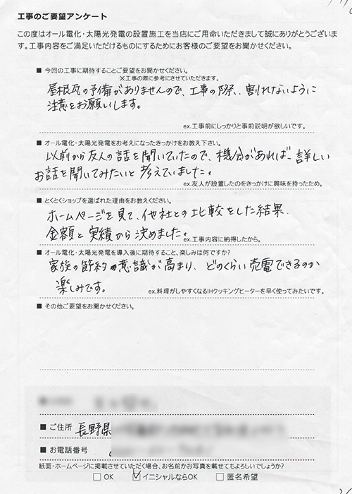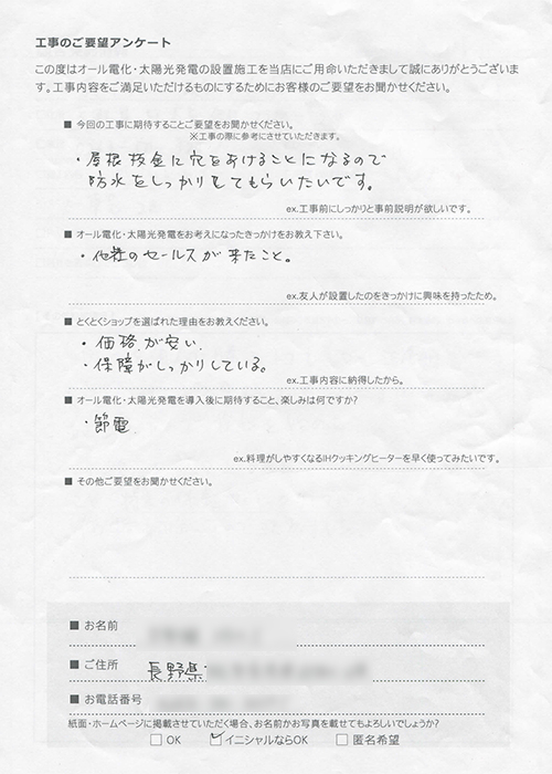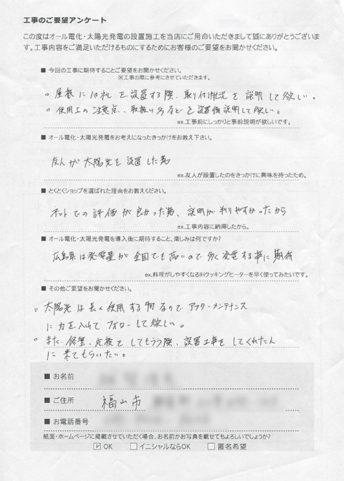 施工前ご要望アンケート 太陽光発電設置 広島県福山市 O様邸