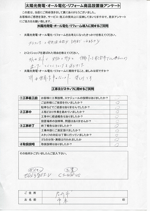 何社かお見積りを取られている中で、娘さんのご紹介もあって当店をお選びいただきました。オール電化も同時に施工させて頂き、秋に向けて太陽光発電にとってもとても良い時期。暑さの中でオール電化の機器は快適性が違います!これからのオール電化生活、便利で快適にそしてエコに!応援していますので、いつでもお困りの事がございましたらお気軽にご連絡お待ちしております!