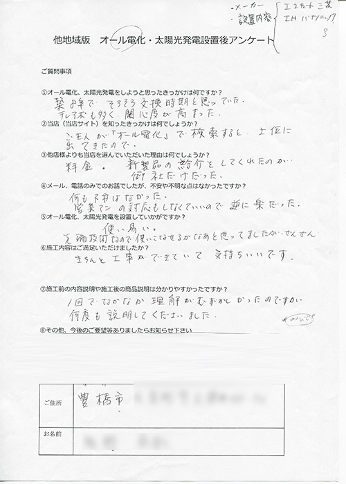 IHクッキングヒーターは既に設置していた中、17年使用した石油ボイラーが古くなってきた為オール電化にしようと決断しました。量販店や地元の電気屋にも見積をお願いしましたが、とくとくさんは価格も安く対応も良かったので決めました。アフターサポートや自社施工というのも信頼のおける点でした。これから、老人も同居している為、火やガス、石油の危険を心配せずに暮らせて安心です。