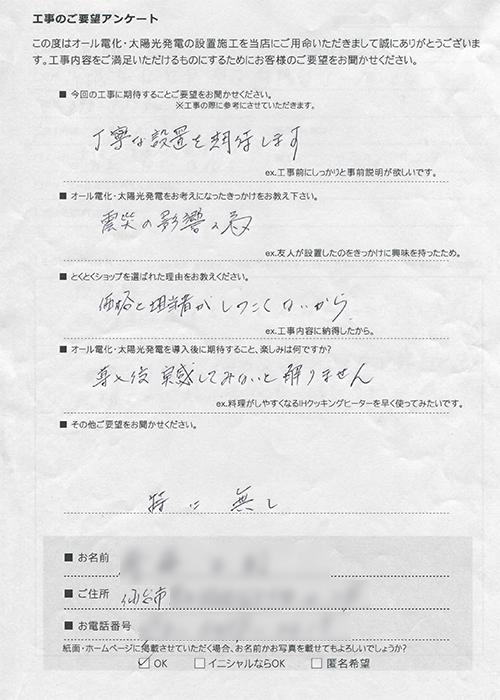 他社でもソーラーフロンティアでお見積を取られていた中、当社をお選び下さいましてありがとうございました。賃貸事業で土地の活用と太陽光で屋根の活用が出来ればとの事で、今の時期太陽光発電の設置は絶好の機会だと私も思います。当社でしたら24時間サポートでいつでも修理に駆けつけますのでご安心下さい。これからも、Y様、そして居住者の方々に満足いただけるサービスで対応していきたいと思いますので、長いお付き合いになりますが、今後ともよろしくお願い致します。この度は当店のご利用、本当にありがとうございました。