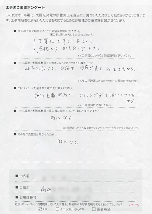 施工前ご要望アンケート 三菱3.57kw設置 高知県 I様邸