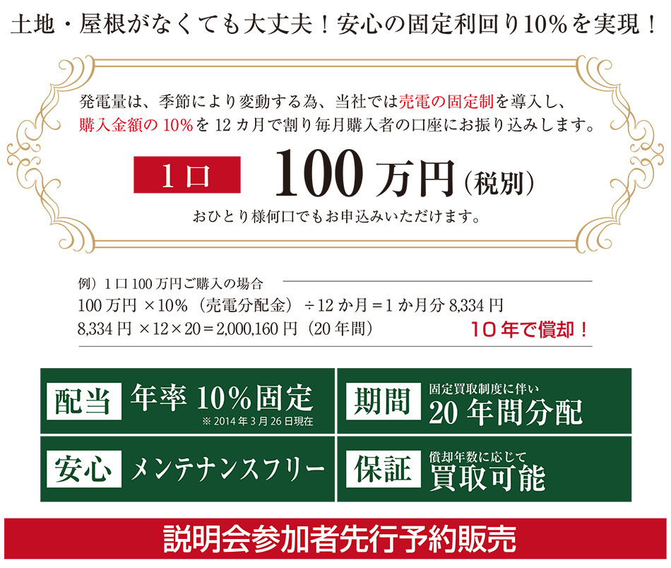 土地・屋根がなくても始められる一区画100万円からの太陽光発電「ソーラーエイド」発電量は、季節により発電が変動する太陽光発電の特性を考え、当社では売電の固定制を導入し、購入価格の10%を12カ月で割り毎月購入者様の口座にお振込みします。おひとり様何口でもお申込みいただけます。