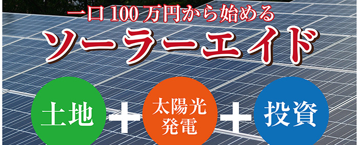 今なら10%の固定年率(10万円/年)で手に入れる事が出来る、合同出資型太陽光発電=『ソーラーエイド』を、太陽光発電・オール電化の販売実績1万件以上の和上住電から販売致します。