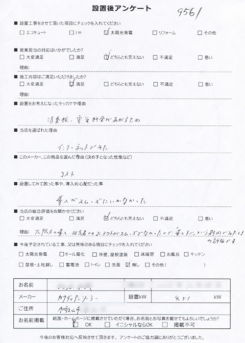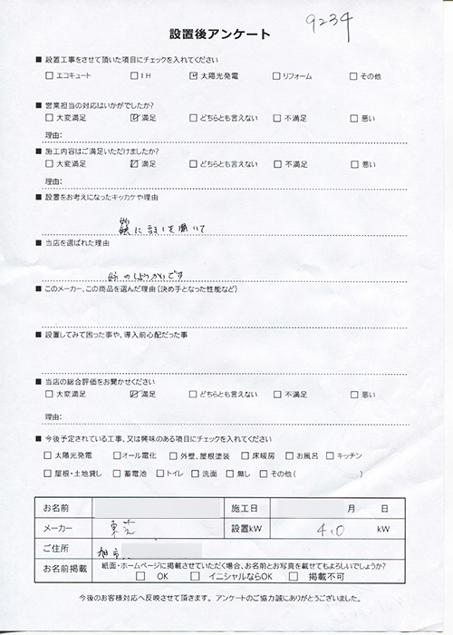 設置後アンケート 東芝太陽光発電 4.0kW 千葉県 N様邸