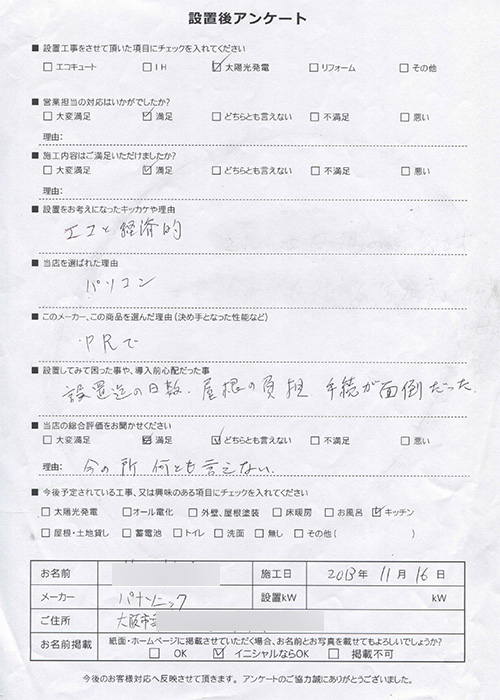 設置後アンケート パナソニック太陽光発電 大阪府 H様邸