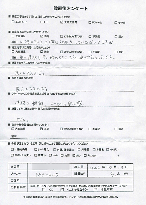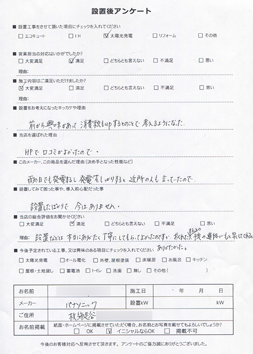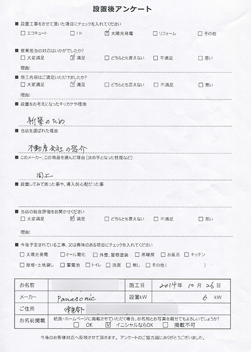設置後アンケート ソーラーフロンティア太陽光発電 8.16kW 静岡県 杉本様邸