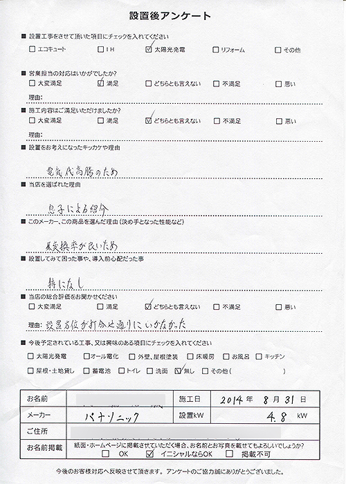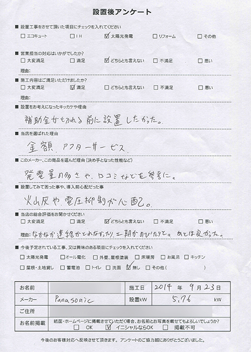 設置後アンケート Panasonic太陽光発電 5.76kW 長野県 S様邸