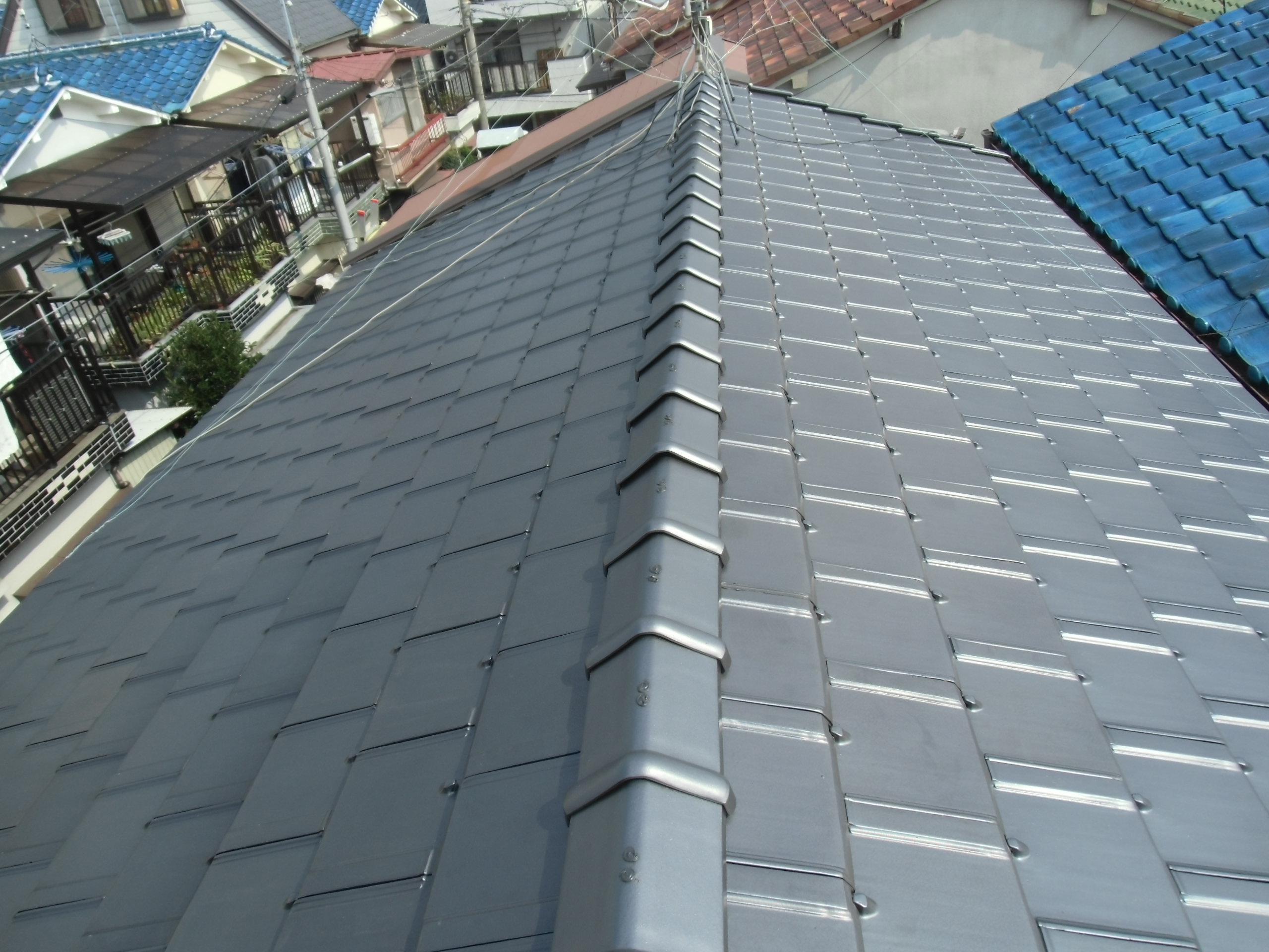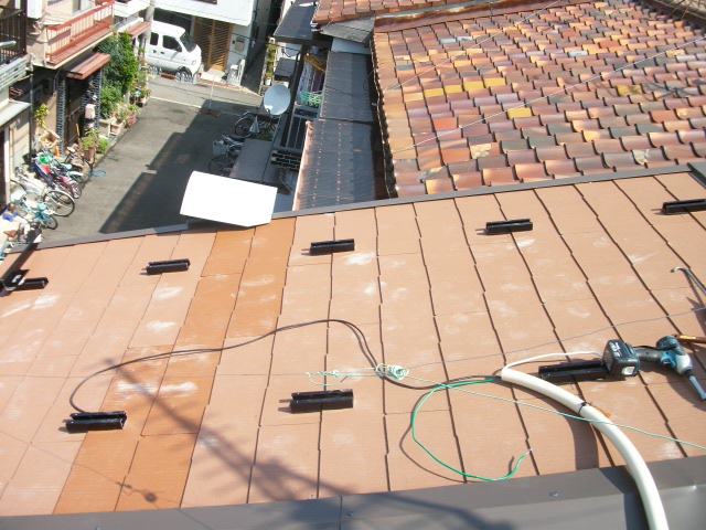 酷暑作業で瓦屋根上は厳しい炎天下状況の為に、作業過程の作業員休憩を頻繁に取る事等、