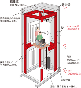 ①構造計算が不要で、リフォームに最適な自立鉄塔付き2階建て専用ホームエレベーター。