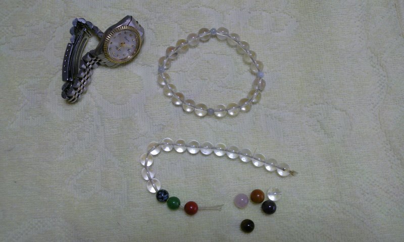 腕時計と水晶等の腕輪(2本)を手首にって、外出前の出来事(願掛け・お守り輪1本切れ破損)