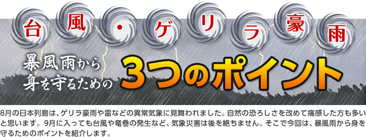 台風・ゲリラ豪雨暴風から身を守るための3つの㌽