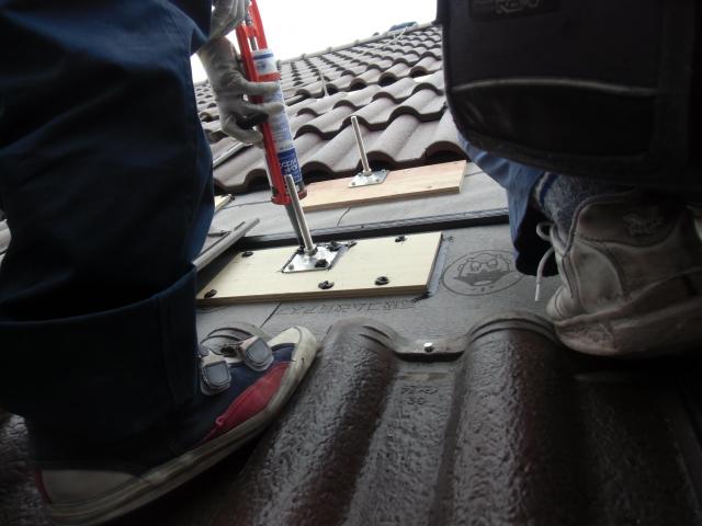 瓦を被せる前に、アンカーのピンにシリコンで防水処理加工後